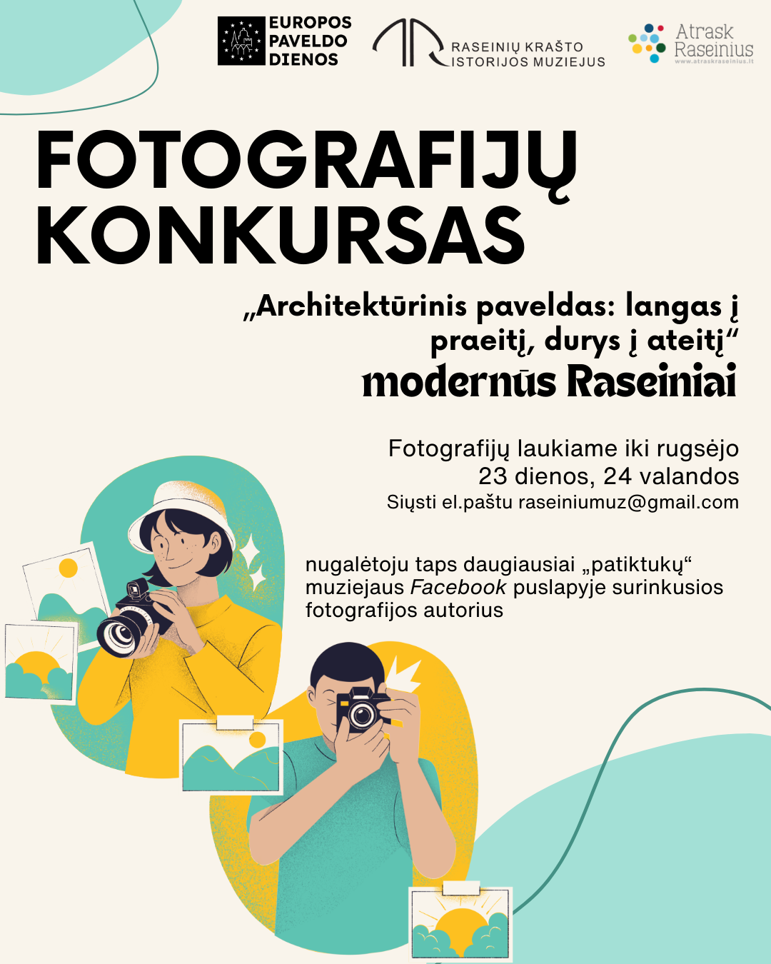 Kviečiame fotografus – ir mėgėjus, ir profesionalus – dalyvauti fotografijų konkurse. Savo kūryba atliepkite į šių metų Europos paveldo dienų’25 temą „Architektūrinis paveldas: langas į praeitį, durys į ateitį“. Užfiksuokite per objektyvą, ką matote pro istorijos langą – kokie tie modernūs Raseiniai – buvo, yra ar galėtų būti.