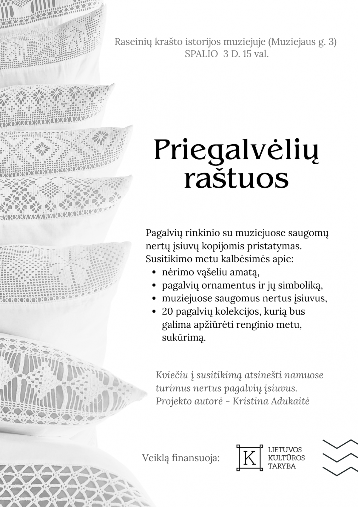 Š. m. spalio 3 dieną, 15 valandą, Raseinių krašto istorijos muziejuje vyks pagalvių rinkinio su muziejuose saugomų nertų įsiuvų kopijomis pristatymas „Priegalvėlių raštuos“. Projektą pristatys autorė Kristina Adukaitė.