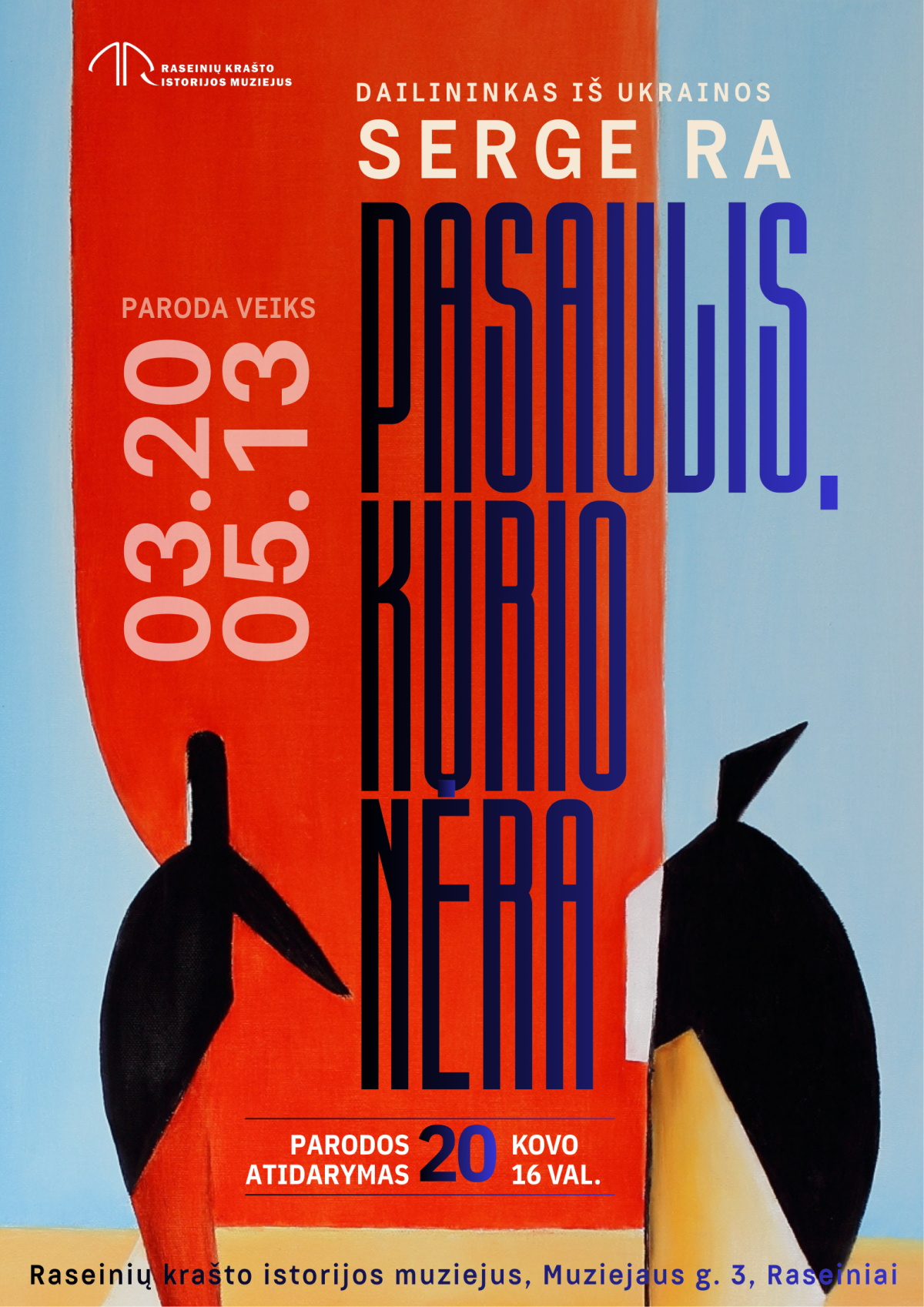 Kovo 20-ąją kviečiame į susitikimą su Ukrainos dailininko Serge Ra kūryba – Raseinių krašto istorijos muziejuje bus atidaryta jo paroda „Pasaulis, kurio nėra“. Džiaugiamės galėdami Raseinių miestui pristatyti Lietuvoje gyvenančio ukrainiečių menininko darbus ir pakviesti į susitikimą su pačiu autoriumi.